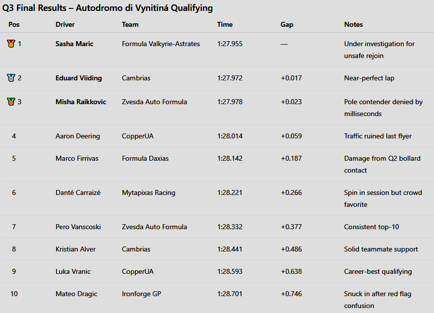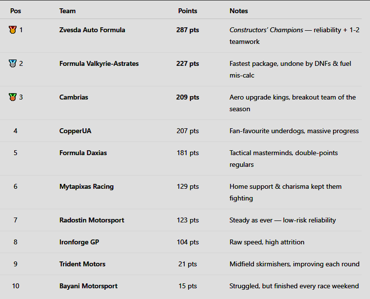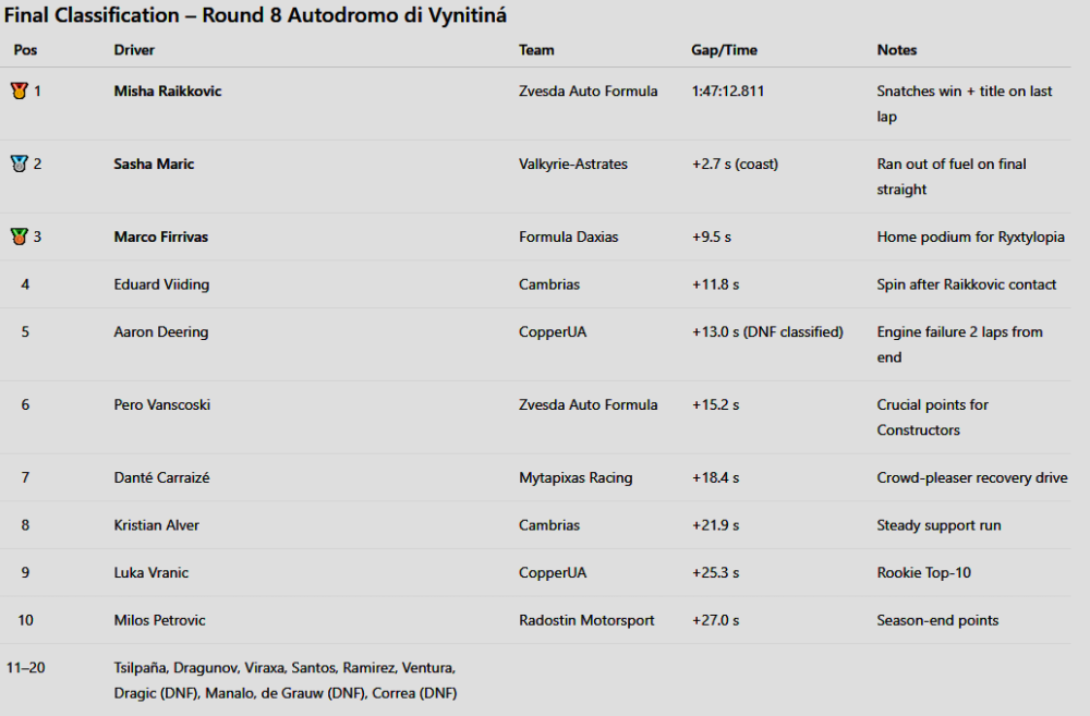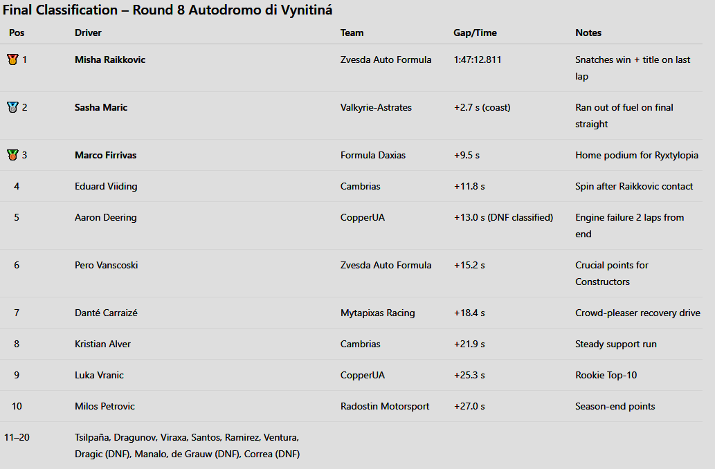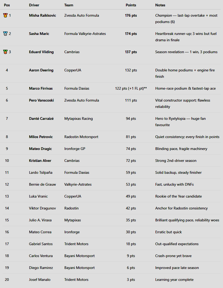 Round 8 Pre-Qualifying Briefing – Autodromo di Vynitiná, Ryxtylopia Track Length: 6.0 km Laps: 60 Conditions: Scorching 31°C, gusty crosswinds on the back straight Overtaking Difficulty: Low (tight final sector) Bias: Power + Slipstream circuits Weather: Dry but unstable air — distant thunder threatening a surprise Heading In Championship: Maric (197 pts) vs. Raikkovic (181 pts) — only 16 points apart. Constructors: Zvesda vs. Valkyrie — equally tight. Dark Horses: Viiding (Cambrias) and Deering (CopperUA) both mathematically still in the hunt for P3 overall. Round 8 Qualifying – Autodromo di Vynitiná, Ryxtylopia Qualifying Headlines “Maric Grabs Pole — but Faces Investigation as Viiding & Raikkovic Loom!” Sasha Maric narrowly claims pole by 0.017 seconds, but his unsafe rejoin could cost him. Viiding continues his late-season form surge, nearly clinching a second pole. Deering furious after catching traffic; radio message: “That lap was mine.” Mytapixas fans went from heart-in-mouths to euphoria after Carraizé recovered from his spin. The paddock waits anxiously — if stewards penalize Maric, Viiding will start from pole for the season finale. Round 8 Pre Race – Autodromo di Vynitiná Grand Prix (Season Finale) Weather: Sunny start → Storm mid-race → Dry sprint finish Laps: 60 Track Length: 6 km Crowd: 230 000 screaming fans Pole: Eduard Viiding (Cambrias Aurora) after Maric’s 5-place grid penalty Pre-Race Drama Maric is demoted to P6 for unsafe re-entry in qualifying. Valkyrie engineers argue the decision; Zvesda quietly celebrate. The Constructors’ title stands at Zvesda 221 pts vs Valkyrie 197 pts — still alive if both Valkyries finish top-4. Thunderheads build on the horizon; FIA warns of possible mid-race downpour. Round 8 Race – Autodromo di Vynitiná Grand Prix (Season Finale) Final Championship Outcome Drivers’ Champion: Misha Raikkovic (Zvesda Auto Formula) Wins by 2 points after Maric’s heartbreak. Constructors’ Champion: Zvesda Auto Formula Vanscoski’s 6th place sealed the crown. Final Drivers’ Championship Standings Final Constructors' Championship Standings1 point