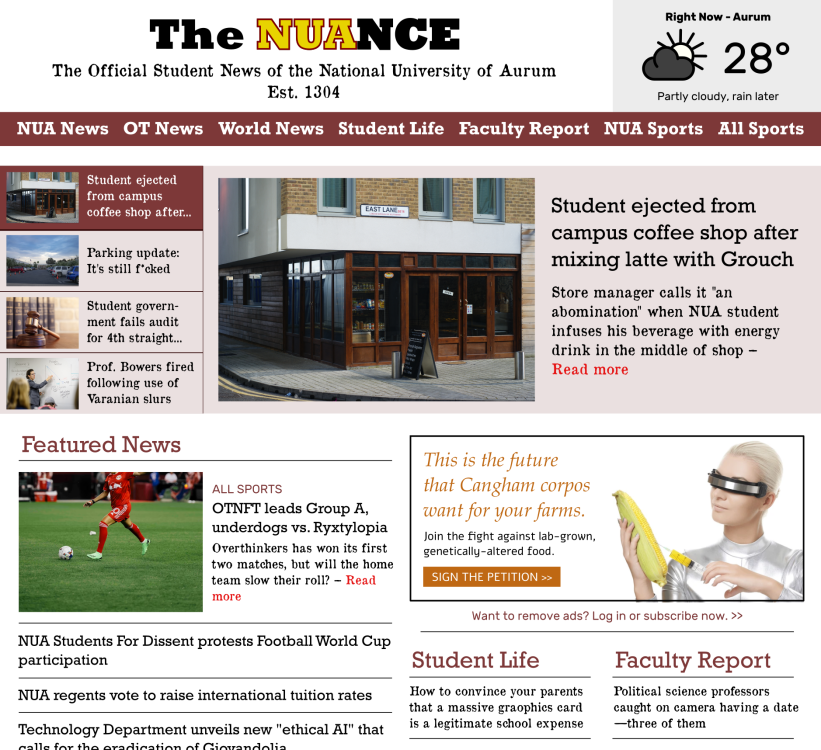 Following reports of “savages”, Giovanniland scrambles to colonize Nur by Jerry Poole, Head Writer NURVILLA, GIOVANNILAND—As state news sources in Nur report on various encounters with “savages” from outside their borders, the cry for help has finally reached the ears of professionals. A fleet of ships landed on the continent to claim the territory in the name of Giovanniland, and the colony of Nurvilla was quickly established. The Giovannilandians wasted little time in wiping out the Nuran savages. “Giovanniland has a long and proud history of bringing civility to uncivilized lands,” said Kristovo Kolombio, who led the initial expedition, in an interview. “We have heard the prayers of the Nuran people and shall surely bring these savages to the light of Violet.” “By force, if necessary,” another official helpfully added. Leaked intelligence reports indicate that at least three people groups have been "converted" so far, with no sign of slowing down. Prime Minister Hessen of Kalmach issued a statement in support of the invasion. This statement was immediately retracted and replaced with a declaration of war as Giovannilandian forces crossed the Kalmach border. A representative of the Infinite Emperor of Aukera said something about “heathens fighting heathens”, but we didn’t really understand anything else. Anti-colonial activists could not be reached for comment after our previous feature story. Sources vary as to which people groups in Nur are the savages and which ones are not, but Kolombio assured the Review that this was not an issue. “They will all be Giovannilandians in the end.” -