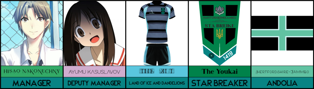 Hertfordshire and Jammbo Rugby 101 The Nowhere-Land - Names For The Tsardom Language Native Script Common Script Anglian 𐑣𐑸𐑑𐑓𐑫𐑛𐑕𐑻𐑯𐑛𐑧𐑨𐑥𐑚𐑴 𐑮𐑨𐑜𐑚𐑰 𐑡𐑫𐑯𐑡𐑺𐑯 Hartferdsierndeambeu Ragbi Junjen Jammbonian Кятфедсуз и Жамбею Рагби Суйуз Kartfedsuw y Zhambeyu Ragbi Suyuz Hertmerian ᚪᚾᛞᛟᛒ ᚱᛁᚷᛒᛇ ᛋᚹᛉᛞᚻᚪᚱᛏᚠᚩᚱᛞᚫᛗᛒᚩ Andeb Rigbi Swydhertfordaambo The Star Breaker - Nickname: The Youkai Language Native Script Common Script Anglian 𐑛𐑧𐑡𐑧𐑳𐑒𐑲 Dejeukai Jammbonian Де Привидени De Privideni Hertmerian ᛁᛞᚱᚪᛁᛏᛇᚪᛞᛖᛁ Idraitsiadei The Things You See If You Have Functioning Eyes - Badge + Flag + Kit Hair Gel And Paint As Standard - The Roster Roster noy yet confirmed - the Youkai promise it will be even more absurd than usual The Tactics... And Things That Aren't Tactics - Style Modifier And RP Things Style: +1.7 Choose my try scorers?: No Choose my kicker?: No RP injuries?: Ask me Godmod scoring events?: Ask me Godmod injuries?: Ask me Godmod other events?: Ask me The Lost Tribes of the Desolation Glacier - Random... Things In 51 BF; 1,476 years ago, the Anglians began to slowly reach the end of their shockingly long migration from northern Andolia. Their destination had been home to the Preselii, Meirion, Glyndoer, Ceredigiae, Maestei, Merthyrni and Alyni since around 1,200 BF. They likely came over to ensure their survival in an area of the continent where few others would care to try and live, an area of Esferos known as the Glacier of Desolation. The Meirion and Ceredigiae tribes were welcoming, the former for pragmatic reasons and the latter because it was in their nature and the beliefs held in their variation of Hertmerian Paganism. The Merthyrni would later be convinced to ally themselves with the Anglians too, and the 3 tribes began to carve out an identity for themselves - the Hertmerians. The other 4 tribes remained antagonistic and it wasn't long before the Ceredigiae led the newly crowned Hertmerians and their Anglian friends into one of the earliest wars in Esferosian history - a war that ended up rendering the Preselii, Glyndoer, Maestei and Alyni extinct. Rumours that the Maestei were able to survive the war by escaping further into central Andolia persist among the peeps of Hertfordshire-Jammbo. -