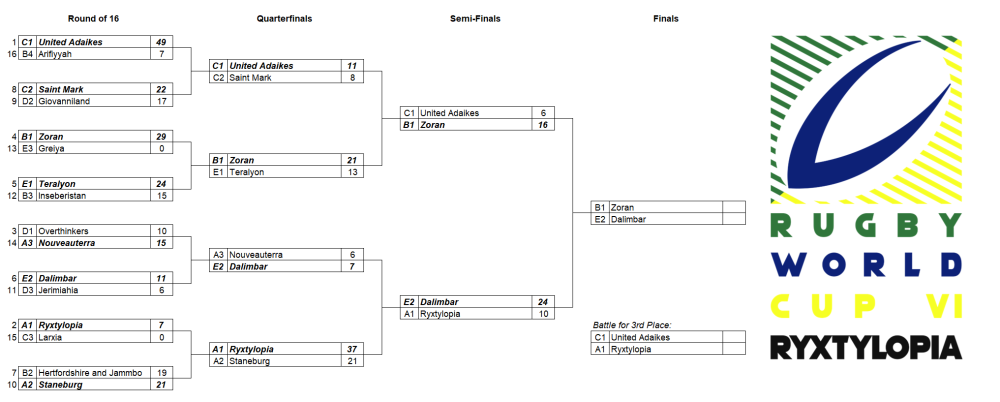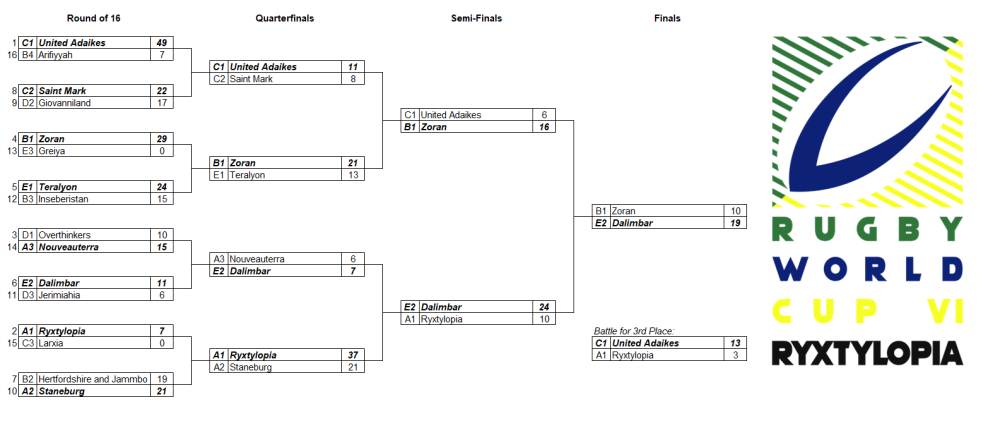 Results of Matchday 3 of the Group Stage of RWC6 Group A Nouveauterra 7–14 Staneburg Materos 27–31 Ryxtylopia Group A Pld W D L PF PA PD BP Pts 1 Ryxtylopia 3 3 0 0 70 49 +21 2 14 Q 2 Staneburg 3 2 0 1 36 26 +10 0 8 Q 3 Nouveauterra 3 1 0 2 25 37 −12 1 5 Q 4 Materos 3 0 0 3 30 49 −19 3 3 Group B Hertfordshire and Jammbo 30–7 Inseberistan Arifiyyah 17–23 Zoran Group B Pld W D L PF PA PD BP Pts 1 Zoran 3 3 0 0 56 39 +17 1 13 Q 2 Hertfordshire and Jammbo 3 2 0 1 55 33 +22 2 10 Q 3 Inseberistan 3 1 0 2 42 69 −27 2 6 Q 4 Arifiyyah 3 0 0 3 49 61 −12 4 4 q Group C Saint Mark 3–0 Ageros Larxia 3–13 United Adaikes Group C Pld W D L PF PA PD BP Pts 1 United Adaikes 3 3 0 0 72 34 +38 2 14 Q 2 Saint Mark 3 2 0 1 34 36 −2 2 10 Q 3 Larxia 3 1 0 2 18 23 −5 1 5 Q 4 Ageros 3 0 0 3 10 41 −31 2 2 Group D Giovanniland 16–10 Jerimiahia Zogradia 3–18 Overthinkers Group D Pld W D L PF PA PD BP Pts 1 Overthinkers 3 3 0 0 60 30 +30 1 13 Q 2 Giovanniland 3 2 0 1 53 43 +10 1 9 Q 3 Jerimiahia 3 1 0 2 44 39 +5 3 7 Q 4 Zogradia 3 0 0 3 17 62 −45 0 0 Group E Dalimbar 18–10 Greiya Varanius 0–3 Teralyon Group E Pld W D L PF PA PD BP Pts 1 Teralyon 3 2 1 0 45 21 +24 2 12 Q 2 Dalimbar 3 2 1 0 49 38 +11 1 11 Q 3 Greiya 3 1 0 2 51 39 +12 2 6 Q 4 Varanius 3 0 0 3 7 54 −47 2 2 q qualification by highest Points between all 4th-placed teams Rankings based on Group Positions Group Winners Pld W D L PF PA PD BP Pts Grp 1 United Adaikes 3 3 0 0 72 34 +38 2 14 C 2 Ryxtylopia 3 3 0 0 70 49 +21 2 14 A 3 Overthinkers 3 3 0 0 60 30 +30 1 13 D 4 Zoran 3 3 0 0 56 39 +17 1 13 B 5 Teralyon 3 2 1 0 45 21 +24 2 12 E Group Runners-up Pld W D L PF PA PD BP Pts Grp 6 Dalimbar 3 2 1 0 49 38 +11 1 11 E 7 Hertfordshire and Jammbo 3 2 0 1 55 33 +22 2 10 B 8 Saint Mark 3 2 0 1 34 36 −2 2 10 C 9 Giovanniland 3 2 0 1 53 43 +10 1 9 D 10 Staneburg 3 2 0 1 36 26 +10 0 8 A Group 3rd Placers Pld W D L PF PA PD BP Pts Grp 11 Jerimiahia 3 1 0 2 44 39 +5 3 7 D 12 Greiya 3 1 0 2 51 39 +12 2 6 E 13 Inseberistan 3 1 0 2 42 69 −27 2 6 B 14 Larxia 3 1 0 2 18 23 −5 1 5 C 15 Nouveauterra 3 1 0 2 25 37 −12 1 5 A Knockouts Stage Picture Greiya and Inseberistan, as well as Larxia and Nouveauterra are interchanged to follow rule that no teams from the same group will meet in the Round of 16.