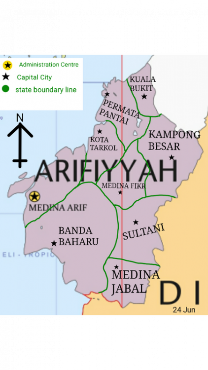 OVERVIEW ARIFIYYAH DARUL FIKR Flag Coat of Arms Motto: God is Great Location Arifiyyah is located on the continent of Aura in the TWP World -Population:12,759,036 -Density: 320 people/km² Main Name:Arifiyyah Darul Fikr Capital:Medina Arif City Largest City:Banda Besar City Official Language: Arifianic,Common National Language:Arifianic Demonym:Arifian Government: - King:Sultan Arif Nazhim Shah(Sultan Arifiyyah IV) - Chief Minister: Tun Bendahara Rais Zuhdi -Minister of Defence: Dato' Ilham Mustaqim -Minister of Finance, International Trade and Economy:Danial Mukhriz - -Minister of Foreign Affairs:Lee Jian Ying -Minister of Home Affairs:Albert Johnston Legislature: - Upper House: Majlis Pentadbiran Negara - Lower House: Dewan Rakyat Land Area: 39 871 km² Water Area:197.86km² Water %: 0.42% GDP (nominal):AFR61.5 Trillion GDP (nominal) per capita:AFR 10,117 Human Development Index (NS Version):67.75 Currency:Arifiyyah Ringgit(AR) Time Zone:UTC+8 Drives on the:Right Side Calling code:+60 Internet TLD:AF RUKUN NEGARA BANGSA(PILLARS OF NATIONSTATES) Rukun Negara Bangsa became the ideology and the core of the lives of Arifiyyah leaders and communities which was inaugurated by Sultan Nazim Shah, Sultan Arifiyyah II to foster togetherness among the people regardless of appearance, age, way of life and religion. Consist of eight pillars. Arifianic Language Bahawasanya kami,rakyat ARIFIYYAH berikrar dan berjanji akan menumpukan taat setia kepada negara dan mengamalkan kehidupan masyarakat bertamadun berteraskan prinsip-prinsip berikut: 1. Kepercayaan kepada Tuhan 2. Kesetiaan kepada Pemimpin dan Negara 3. Keluhuran Perlembagaan 4. Berilmu dan Berakhlak Mulia 5. Berintegriti dan Bermaruah 6. Kedaulatan Undang-undang 7. Bersatupadu dan Kebersamaan 8. Memelihara Negara,Agama dan Bangsa English/Common Language That we, the people of ARIFIYYAH pledge and promise to devote loyalty to the country and practice the life of a civilized society based on the following principles: 1. Faith in God 2. Loyalty to Leader and Country 3. Supremacy of the Constitution 4. Knowledgeable and Noble 5. Integrity and Dignity 6. Rule of Law 7. Unity and Togetherness 8. Preserving the Country,Religion and Nation MAP OF ARIFIYYAH -