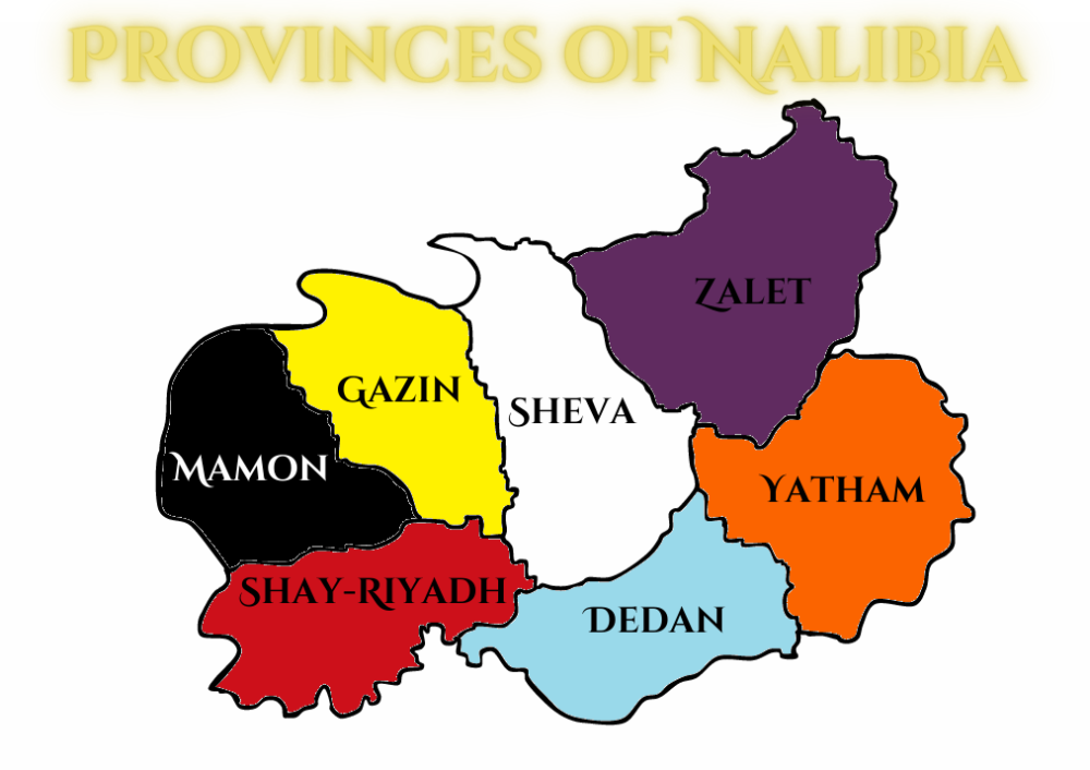 This Page is intended to outline in summary or detail all aspects of the nation of Nalibia. With time I hope to include facts, histories, mythology, holidays, culture, cuisine, religion, etcetera. I hope you enjoy the read, and feel free to DM ideas for collaborating histories. Thank you. National Summary Holidays and Celebrations Culture and Pastimes Government Offices and Titles Official Faith (Click the Province name to jump to their section) There are seven provinces in Nalibia each ruled over by a monarch. Zalet Province: Population- 1,680,904; Imperial Capital city is Chikere Gazin Province: Population- 2,033,917; Capital city is Anava Yatham Province: Population- 2,231,510; Capital city is Hammaana Sheva Province: Population- 2,981,923; Capital city is Cyro Shay-Riyadh Province: Population- 1,134,339; Capital city is Geo Mamon Province: Population- 1,573,121; Capital city is Gayarou Dedan Province: Population- 2,244,742; Capital city is Yerah National Population by Gender Total Population 13,880,456 Male 6,737,659 Female 7,142,797 National Population by Age Age Under 5 5 - 14 15 - 24 25 - 44 45 - 65 Over 65 Male 745,938 1,162,883 2,021,431 1,756,628 741,542 309,237 Female 766,823 1,223,644 2,120,943 1,920,930 763,645 346,812 National Population by Ethnicity Ancestry % Total Nalibian 65.3% 9,063,938 Nur 13.1% 1,818,340 Doll Guldur 8.6% 1,193,719 Andolia 6.4% 888,349 Aura 4.1% 569,099 Polaris 2.5% 347,011 Nalibia recognizes six periods of history marked by their years of unification and separation. During the times of separation different forms of governments ruled over the people and land. However, all times of unification were governed by forms of varying types of monarchy. Pre-Founding Before 2130BF The First Founding, lasted 1,751 years 2130BF to 379BF Era of chaos, endured 419 years 379BF to 40AF The Second Founding, lasted 588 years 40AF to 628AF Age of Discovery, endured 387 years 628AF to 1015AF The Third Founding, Currently 409 years 1015AF to Present Day