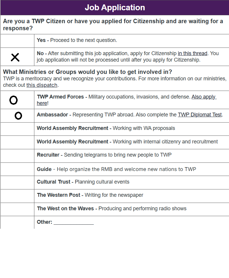 BlackBlicky Posted August 3, 2025 Posted August 3, 2025 Job Application Are you a TWP Citizen or have you applied for Citizenship and are waiting for a response? Yes - Proceed to the next question. X No - After submitting this job application, apply for Citizenship in this thread. You job application will not be processed until after you apply for Citizenship. What Ministries or Groups would you like to get involved in? TWP is a meritocracy and we recognize your contributions. For more information on our ministries, check out this dispatch. TWP Armed Forces - Military occupations, invasions, and defense. Also apply here! Ambassador - Representing TWP abroad. Also complete the TWP Diplomat Test. X World Assembly Recruitment - Working with WA proposals World Assembly Recruitment - Working with internal citizenry and recruitment Recruiter - Sending telegrams to bring new people to TWP X Guide - Help organize the RMB and welcome new nations to TWP Cultural Trust - Planning cultural events The Western Post - Writing for the newspaper The West on the Waves - Producing and performing radio shows Other: ______________